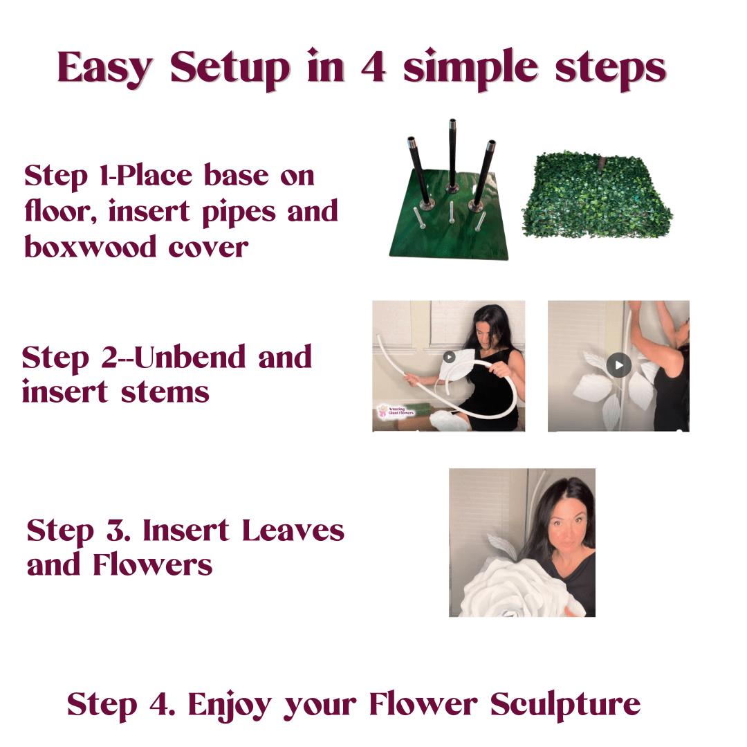 "Experience the excitement of unboxing your custom giant foam flowers and see how effortlessly they transform your space. Follow our step-by-step guide to quickly set up your pre-decorated bases and arrange your flowers for a breathtaking display, ready for your special event."