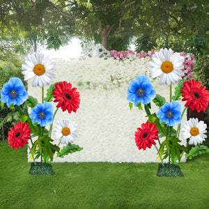 5 ft Tall Backdrop: Includes one 24" diameter red gerbera, two 18" diameter white daisies and blue poppies, and three 12" diameter flowers, arranged at 5 ft, 4 ft, 3 ft, and 2 ft heights.
