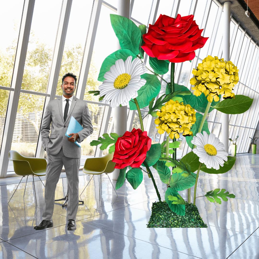 3-Flower Centerpiece: Includes three flowers, each 18" in diameter, standing at 3 ft, 3.5 ft, and 4 ft tall, perfect for smaller or intimate corporate settings.